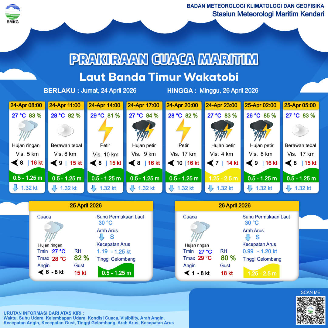 23 Apr 26, 22.00 1 hari 6 jam kedepan | Timur 6 kt Gust Peningkatan kecepatan angin yang singkat dan tiba-tiba : 12 kt | 0.6 m Rendah | Selatan 1.3 Knots | 26 °C | 81 % | |