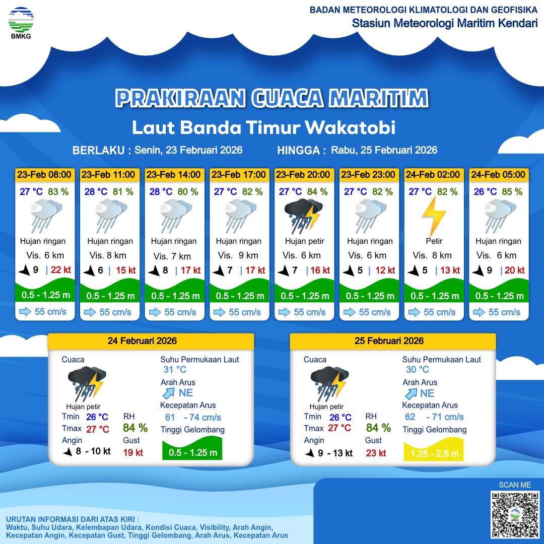 23 Feb 26, 05.00 4 jam kedepan | Barat Laut 8 kt Gust Peningkatan kecepatan angin yang singkat dan tiba-tiba : 18 kt | 0.7 m Rendah | Timur Laut 64.0 cm/s | 28 °C | 80 % | |