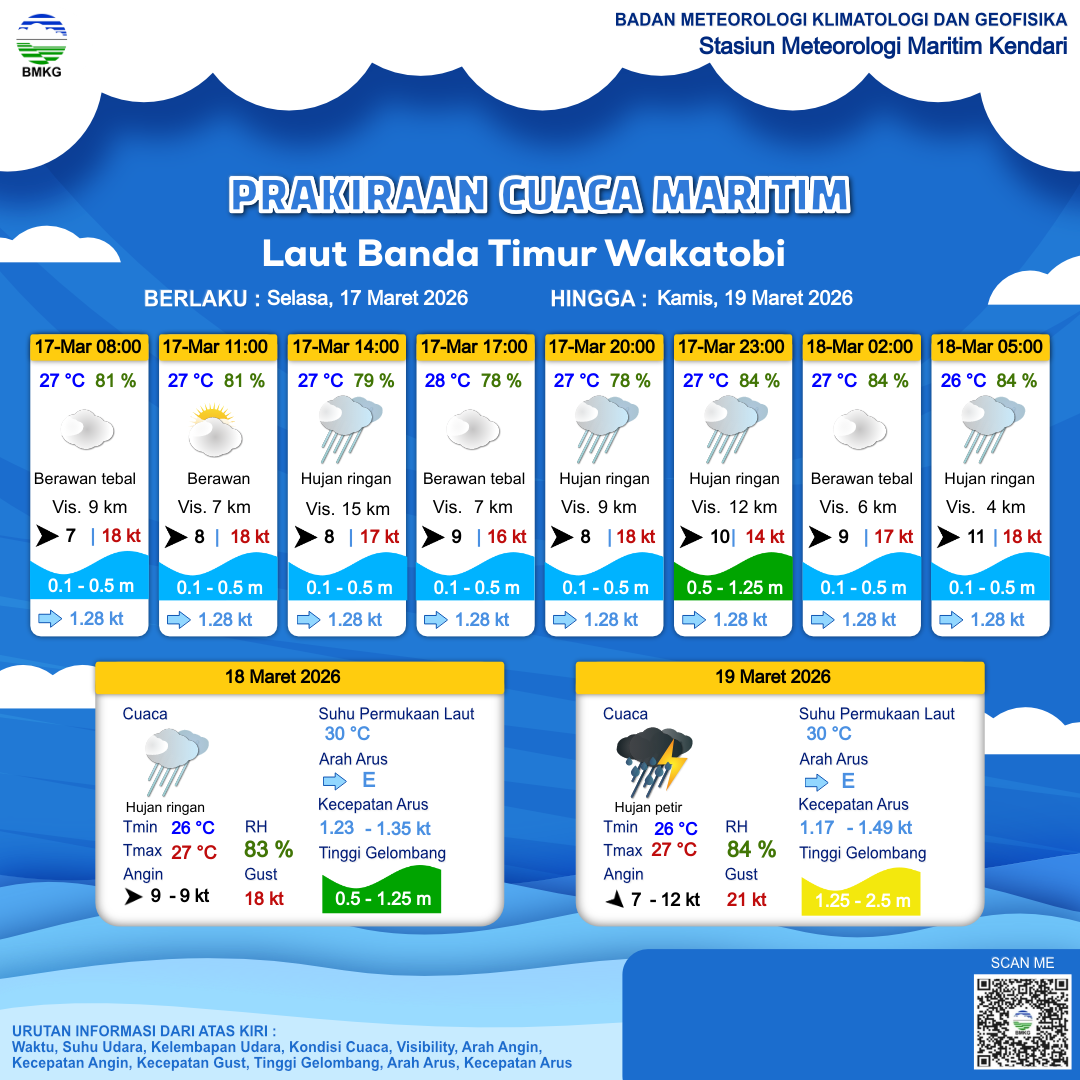 17 Mar 26, 09.00 2 jam kedepan | Barat 9 kt Gust Peningkatan kecepatan angin yang singkat dan tiba-tiba : 16 kt | 0.5 m Rendah | Timur 1.4 Knots | 28 °C | 78 % | |