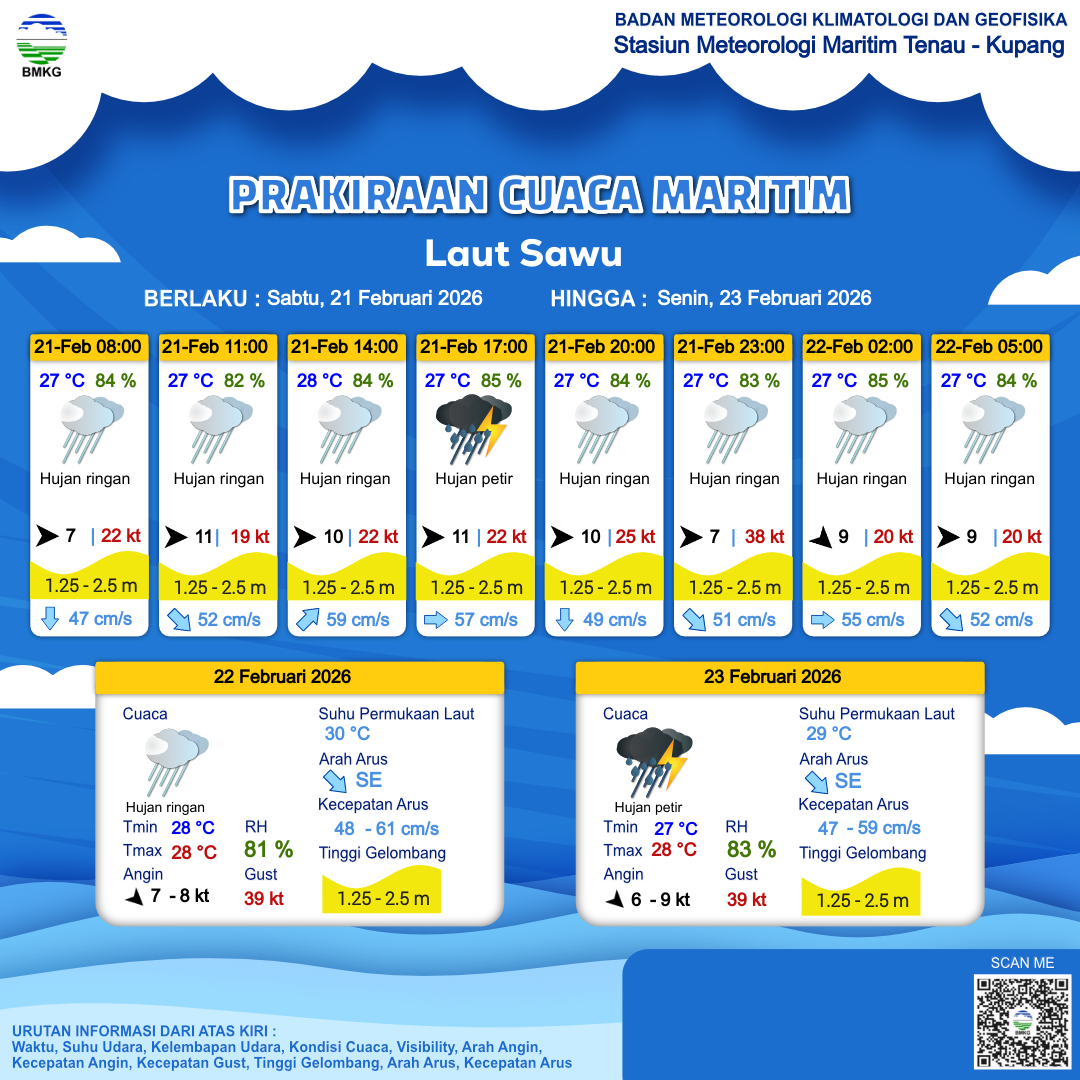 21 Feb 26, 21.00 4 jam kedepan | Barat 9 kt Gust Peningkatan kecepatan angin yang singkat dan tiba-tiba : 20 kt | 1.8 m Sedang | Tenggara 52.0 cm/s | 27 °C | 84 % | |