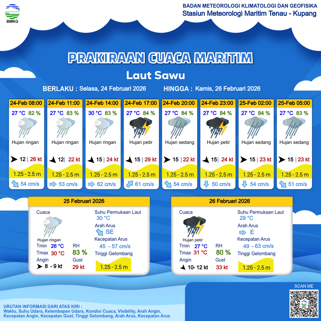 24 Feb 26, 20.00 2 jam kedepan | Hujan Sedang | Barat 15 kt Gust Peningkatan kecepatan angin yang singkat dan tiba-tiba : 23 kt | | | 27 °C | 83 % |
