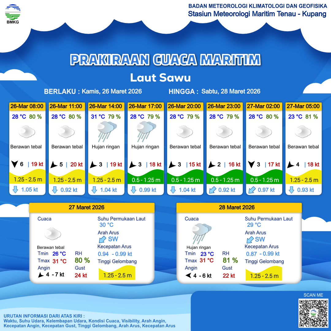 26 Mar 26, 18.00 8 jam kedepan | Utara 3 kt Gust Peningkatan kecepatan angin yang singkat dan tiba-tiba : 17 kt | 1.2 m Rendah | Barat Daya 1.0 Knots | 28 °C | 80 % | |