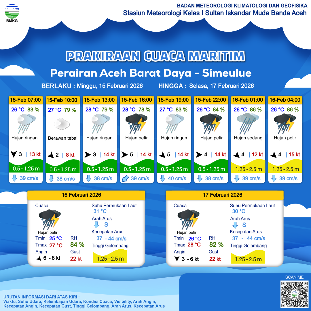 15 Feb 26, 06.00 2 jam kedepan | Barat 3 kt Gust Peningkatan kecepatan angin yang singkat dan tiba-tiba : 14 kt | 1.2 m Rendah | Selatan 38.0 cm/s | 28 °C | 79 % | |