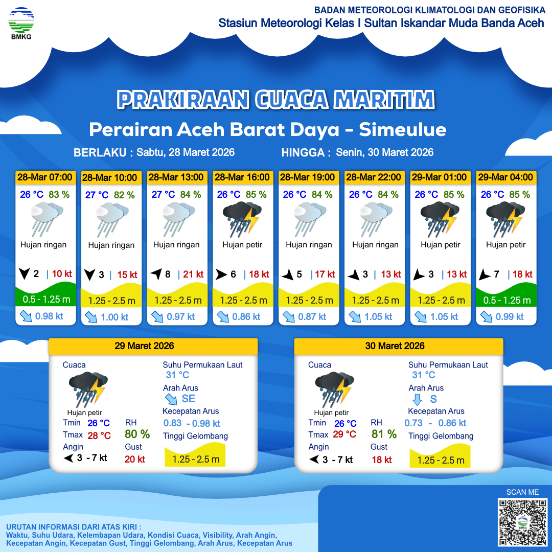 28 Mar 26, 23.00 16 jam kedepan | Tenggara 7 kt Gust Peningkatan kecepatan angin yang singkat dan tiba-tiba : 18 kt | 1.2 m Rendah | Tenggara 1.0 Knots | 26 °C | 85 % |