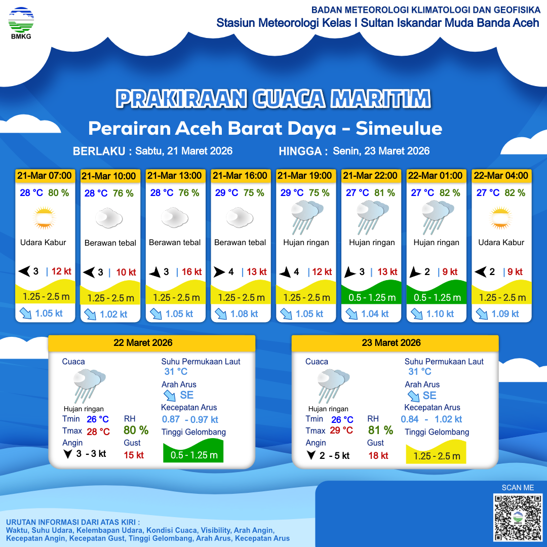 21 Mar 26, 21.00 4 jam kedepan | Timur 2 kt Gust Peningkatan kecepatan angin yang singkat dan tiba-tiba : 9 kt | 1.3 m Sedang | Tenggara 1.1 Knots | 27 °C | 82 % | |