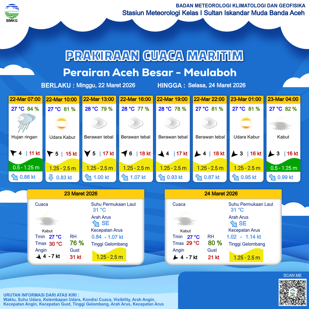 22 Mar 26, 04.00 6 jam kedepan | Tenggara 5 kt Gust Peningkatan kecepatan angin yang singkat dan tiba-tiba : 16 kt | 1.3 m Sedang | Selatan 0.9 Knots | 28 °C | 80 % | |