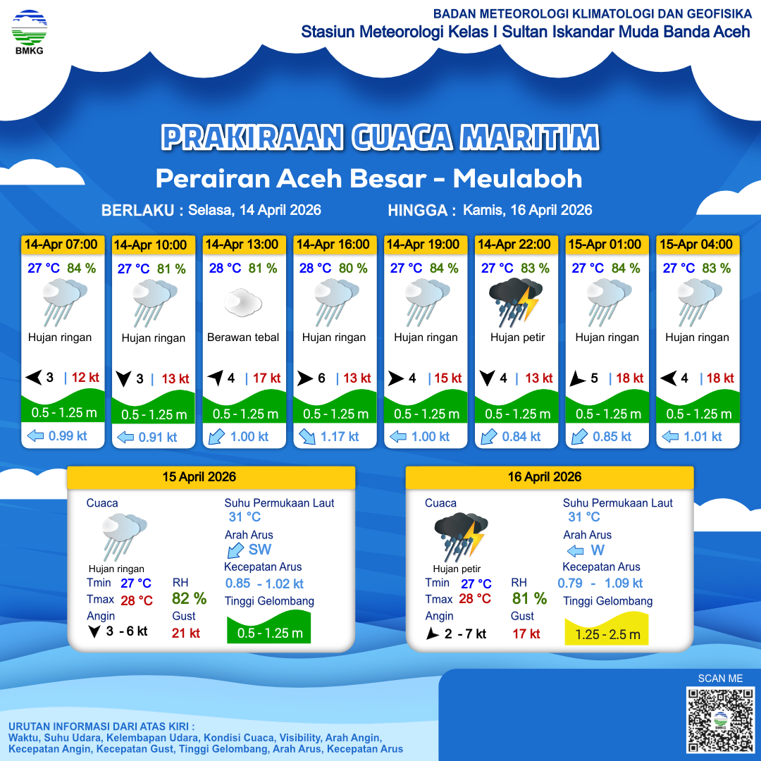14 Apr 26, 20.00 4 jam kedepan | Timur 4 kt Gust Peningkatan kecepatan angin yang singkat dan tiba-tiba : 18 kt | 0.8 m Rendah | Barat 1.0 Knots | 27 °C | 84 % | |