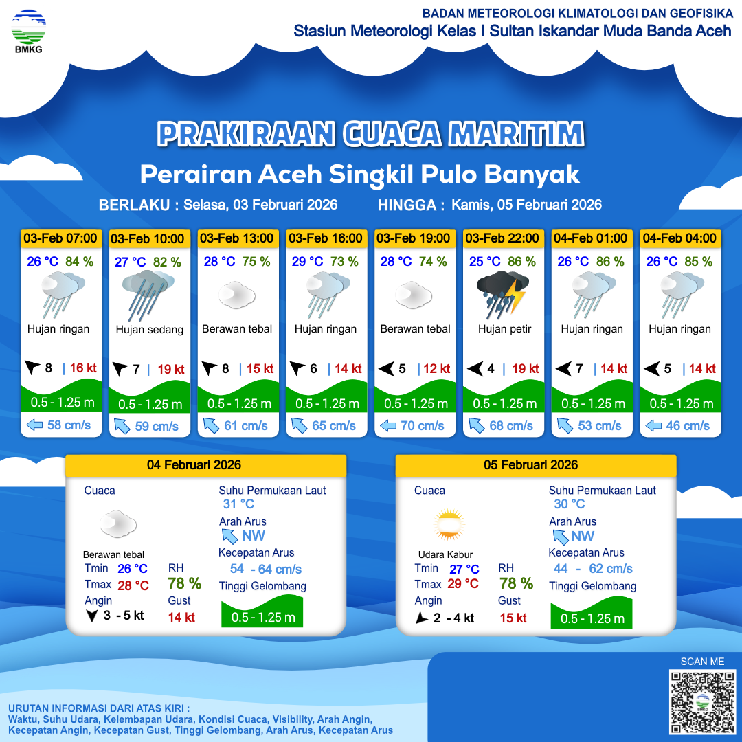 3 Feb 26, 05.00 4 jam kedepan | Tenggara 8 kt Gust Peningkatan kecepatan angin yang singkat dan tiba-tiba : 14 kt | 1.1 m Rendah | Barat Laut 60.0 cm/s | 28 °C | 78 % | |