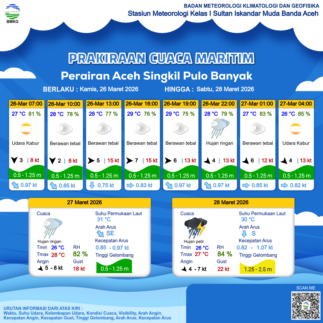 26 Mar 26, 17.00 6 jam kedepan | Barat Laut 6 kt Gust Peningkatan kecepatan angin yang singkat dan tiba-tiba : 11 kt | 1 m Rendah | Timur 0.9 Knots | 27 °C | 82 % | |
