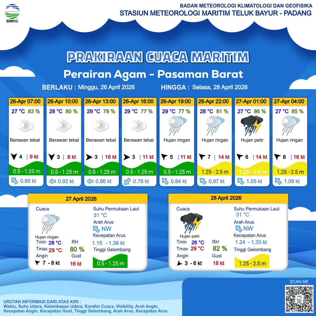 24 Apr 26, 21.00 3 jam kedepan | Utara 2 kt Gust Peningkatan kecepatan angin yang singkat dan tiba-tiba : 8 kt | 1.1 m Rendah | Barat Laut 1.3 Knots | 28 °C | 81 % | |