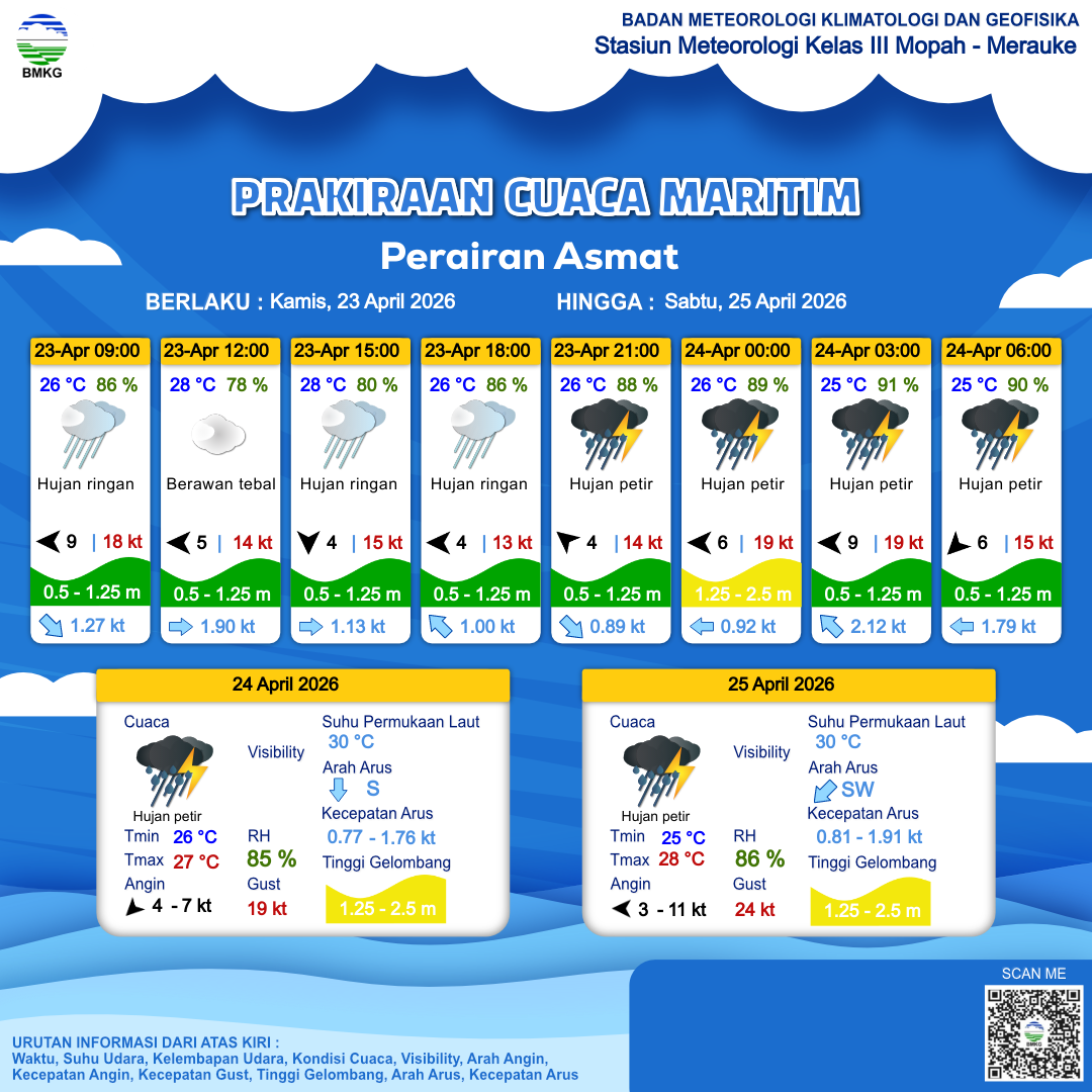 21 Apr 26, 10.00 3 jam kedepan | Barat Daya 4 kt Gust Peningkatan kecepatan angin yang singkat dan tiba-tiba : 12 kt | 0.2 m Tenang | Selatan 0.8 Knots | 28 °C | 78 % | |