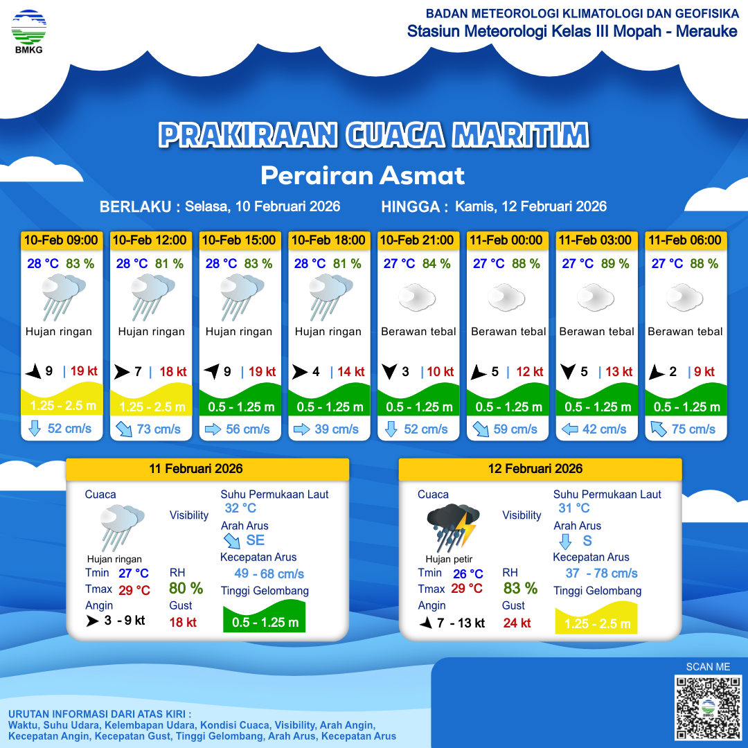 10 Feb 26, 03.00 4 jam kedepan | Barat 7 kt Gust Peningkatan kecepatan angin yang singkat dan tiba-tiba : 18 kt | 1.6 m Sedang | Tenggara 73.0 cm/s | 28 °C | 81 % | |