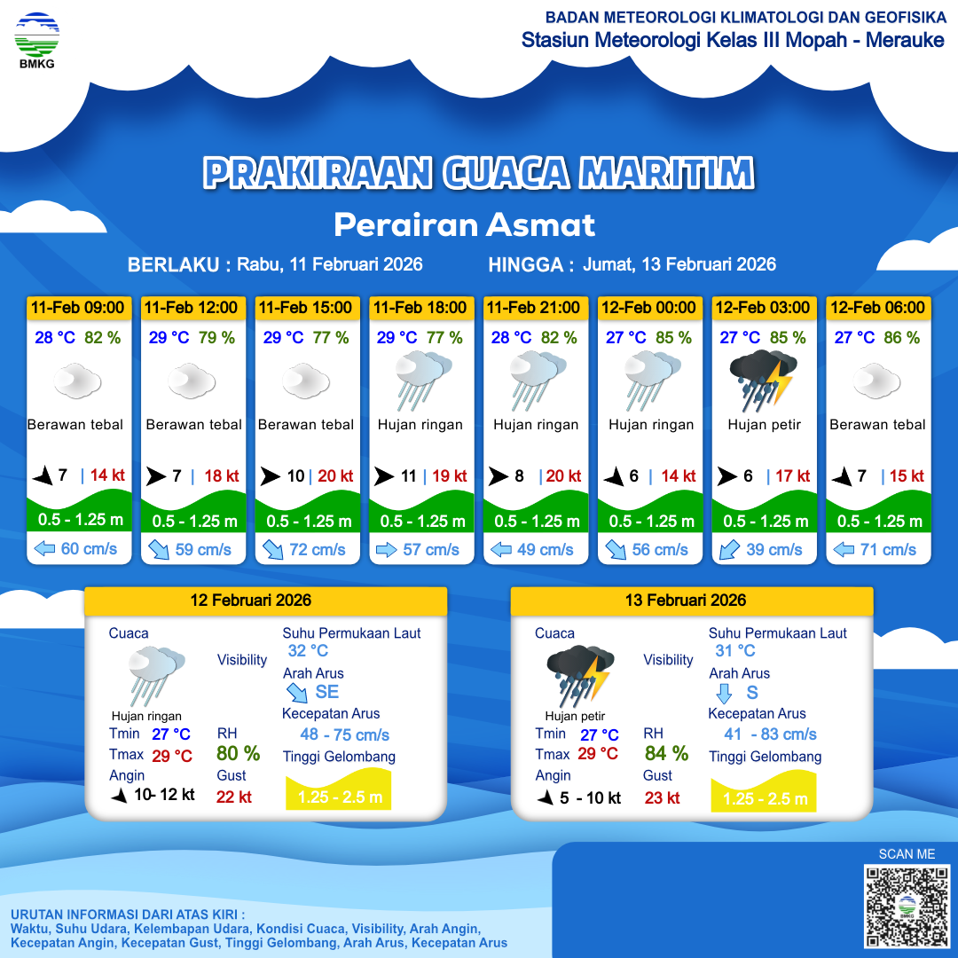 11 Feb 26, 09.00 10 jam kedepan | Barat 11 kt Gust Peningkatan kecepatan angin yang singkat dan tiba-tiba : 19 kt | 0.8 m Rendah | Timur 57.0 cm/s | 29 °C | 77 % | |