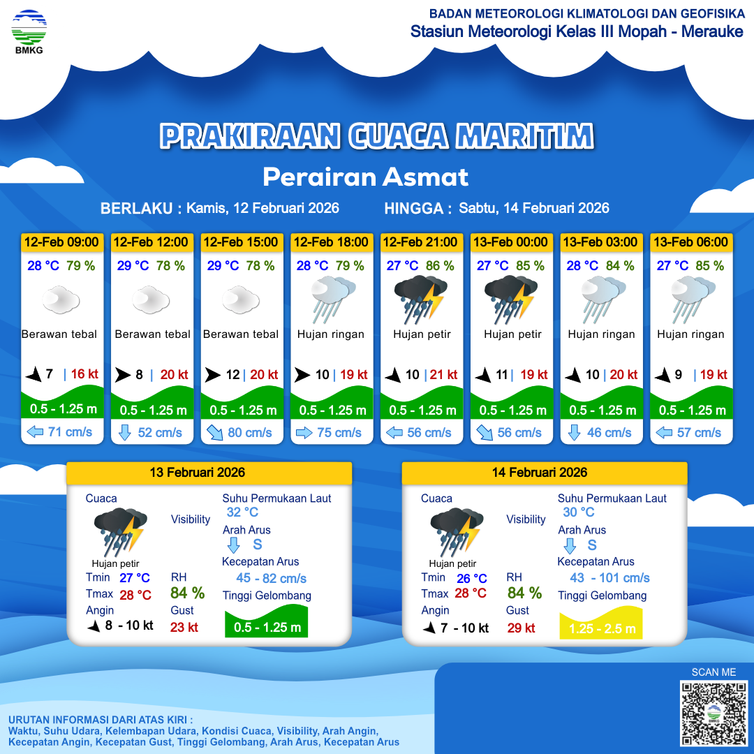 12 Feb 26, 17.00 4 jam kedepan | Barat Laut 10 kt Gust Peningkatan kecepatan angin yang singkat dan tiba-tiba : 22 kt | 1.1 m Rendah | Tenggara 51.0 cm/s | 27 °C | 85 % | |
