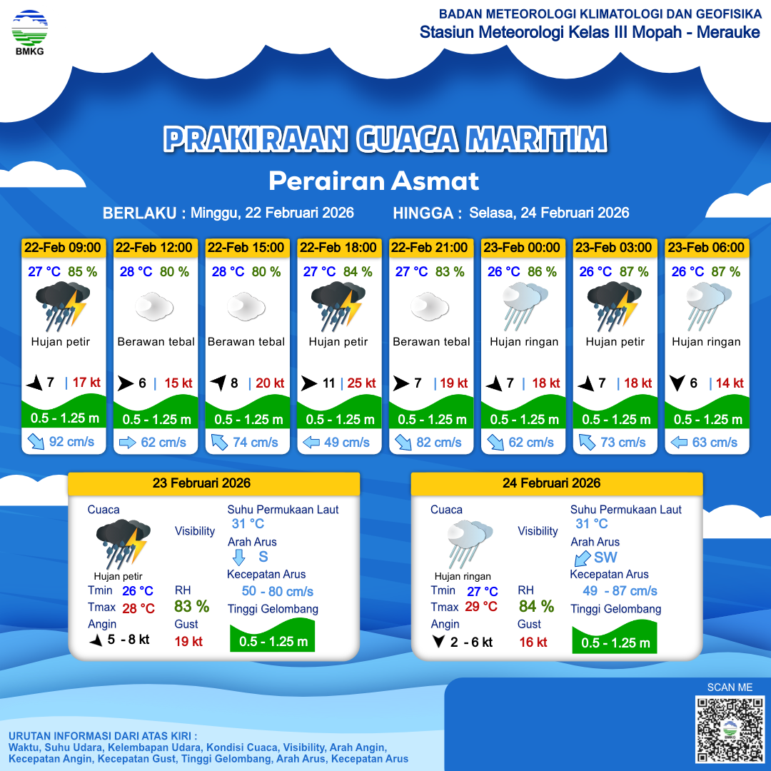 22 Feb 26, 08.00 3 jam kedepan | Barat 11 kt Gust Peningkatan kecepatan angin yang singkat dan tiba-tiba : 25 kt | 1.1 m Rendah | Barat Laut 65.0 cm/s | 28 °C | 82 % | |