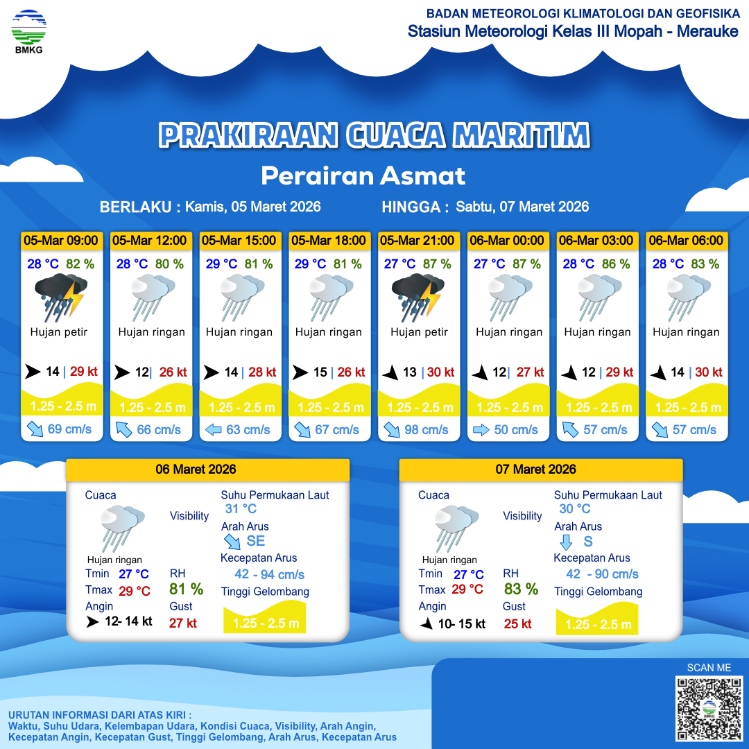 5 Mar 26, 23.00 4 jam kedepan | Hujan Ringan | Barat Laut 14 kt Gust Peningkatan kecepatan angin yang singkat dan tiba-tiba : 27 kt | | | 28 °C | 81 % |