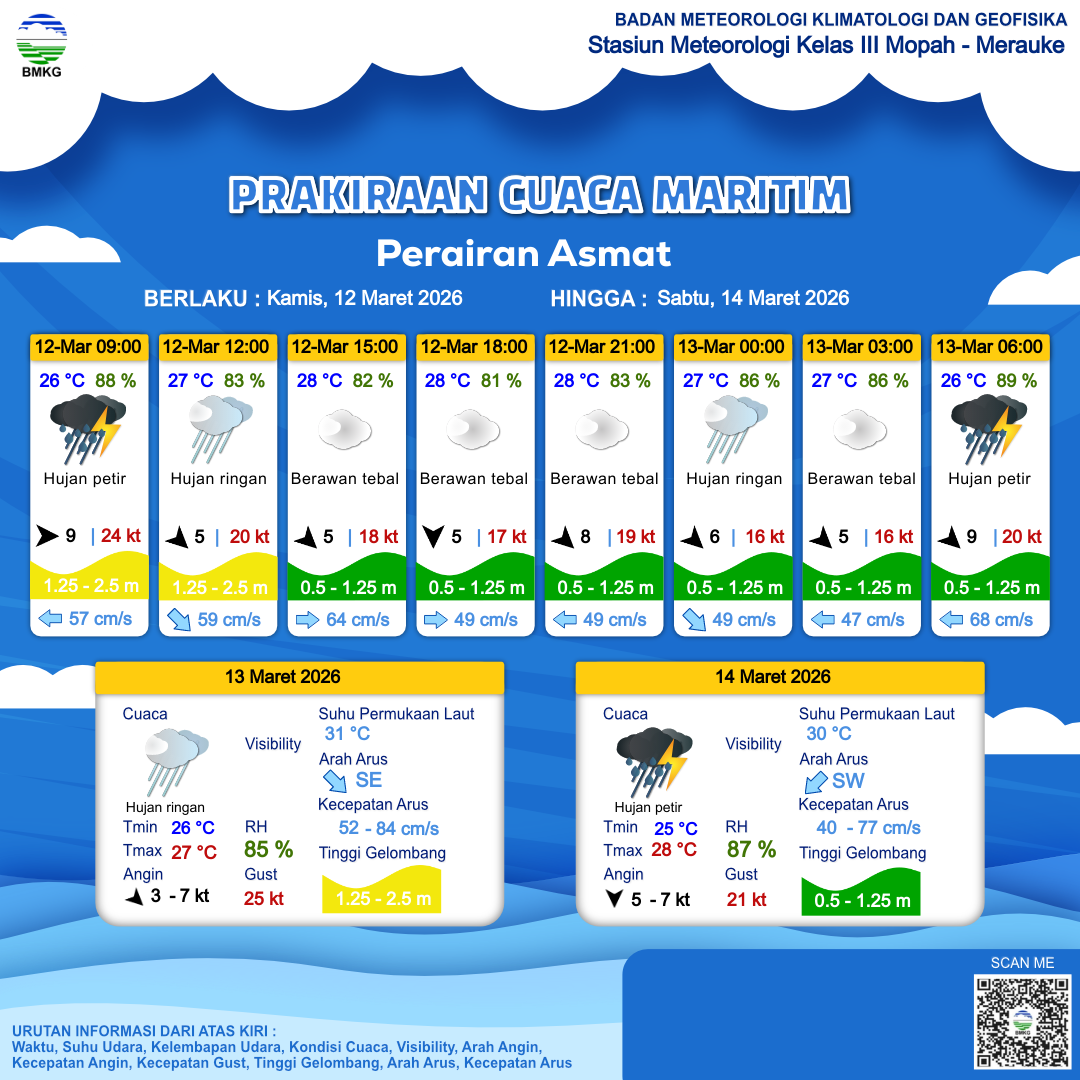 12 Mar 26, 14.00 8 jam kedepan | Barat Laut 6 kt Gust Peningkatan kecepatan angin yang singkat dan tiba-tiba : 20 kt | 0.9 m Rendah | Tenggara 52.0 cm/s | 27 °C | 86 % | |