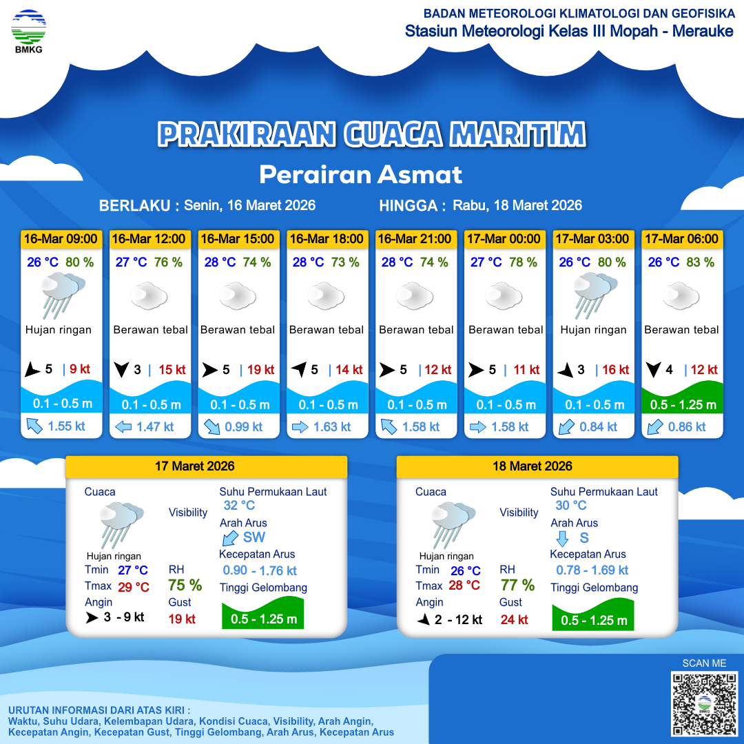 16 Mar 26, 08.00 10 jam kedepan | Barat Daya 5 kt Gust Peningkatan kecepatan angin yang singkat dan tiba-tiba : 15 kt | 0.5 m Rendah | Timur 1.5 knot | 28 °C | 73 % | |