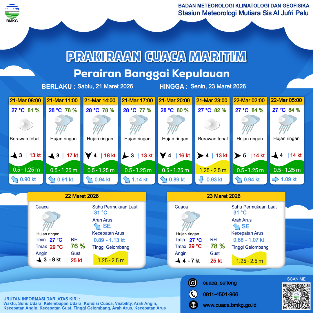 21 Mar 26, 14.00 12 jam kedepan | Barat 4 kt Gust Peningkatan kecepatan angin yang singkat dan tiba-tiba : 14 kt | 1.4 m Sedang | Selatan 0.9 Knots | 27 °C | 81 % | |