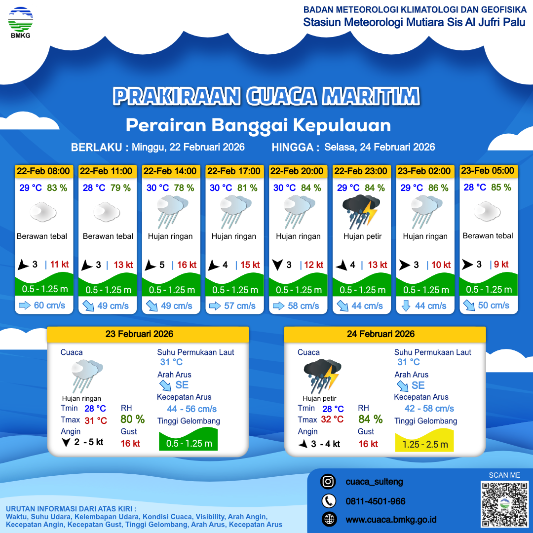 22 Feb 26, 04.00 4 jam kedepan | Timur Laut 3 kt Gust Peningkatan kecepatan angin yang singkat dan tiba-tiba : 13 kt | 0.8 m Rendah | Tenggara 48.0 cm/s | 29 °C | 78 % | |
