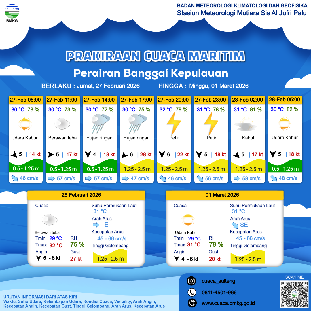 28 Feb 26, 09.00 4 jam kedepan | Utara 8 kt Gust Peningkatan kecepatan angin yang singkat dan tiba-tiba : 26 kt | 1.5 m Sedang | Timur 53.0 cm/s | 32 °C | 71 % | |
