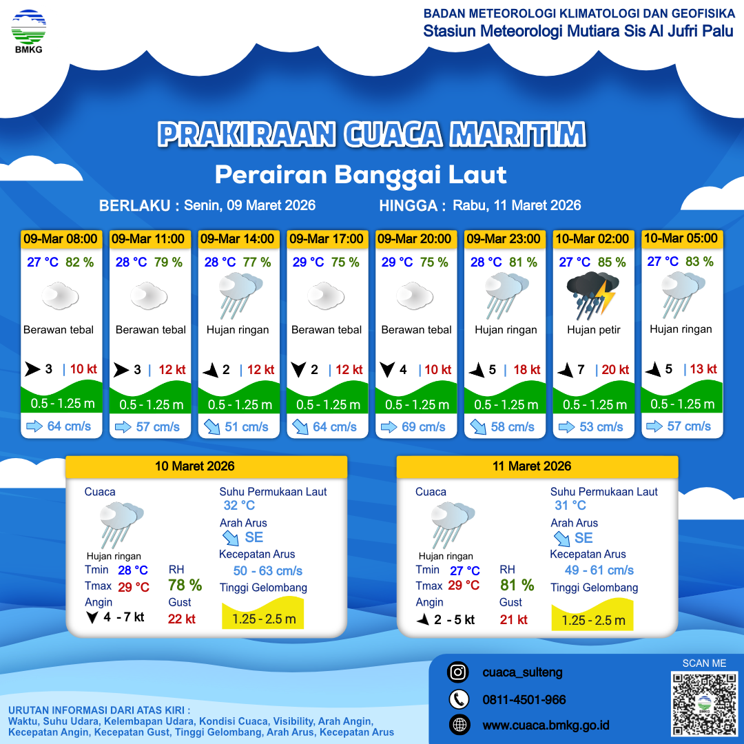 9 Mar 26, 23.00 4 jam kedepan | Berawan Tebal | Barat Laut 4 kt Gust Peningkatan kecepatan angin yang singkat dan tiba-tiba : 10 kt | | | 28 °C | 81 % |