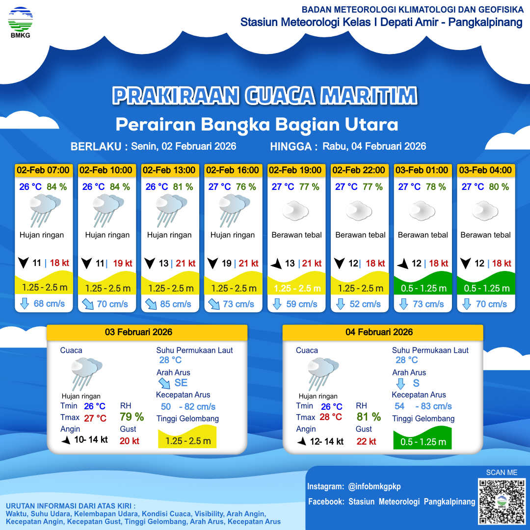 2 Feb 26, 22.00 3 jam kedepan | Berawan Tebal | Utara 12 kt Gust Peningkatan kecepatan angin yang singkat dan tiba-tiba : 17 kt | | | 27 °C | 80 % |