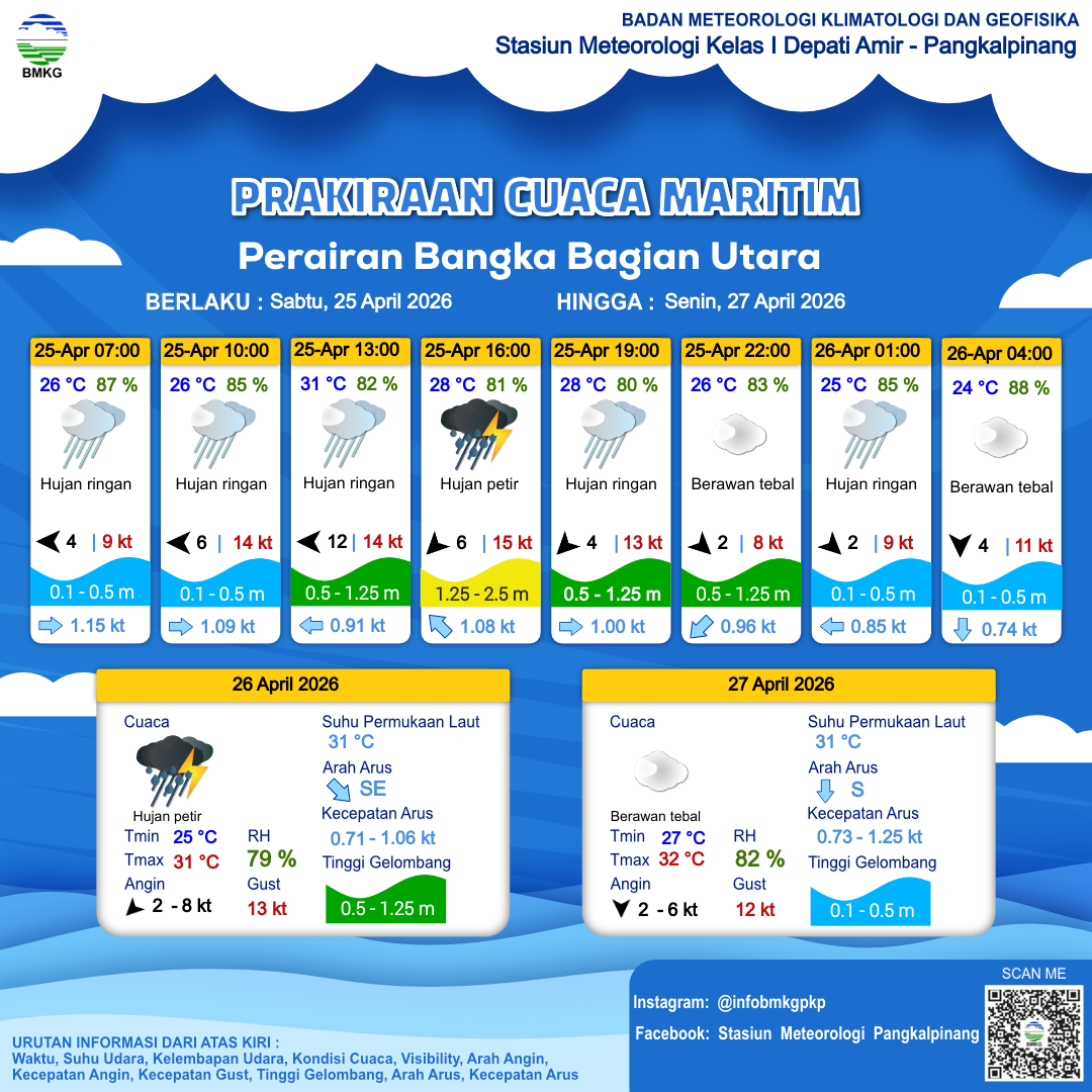 25 Apr 26, 20.00 4 jam kedepan | Utara 4 kt Gust Peningkatan kecepatan angin yang singkat dan tiba-tiba : 11 kt | 0.5 m Rendah | Barat Daya 0.8 Knots | 25 °C | 86 % | |