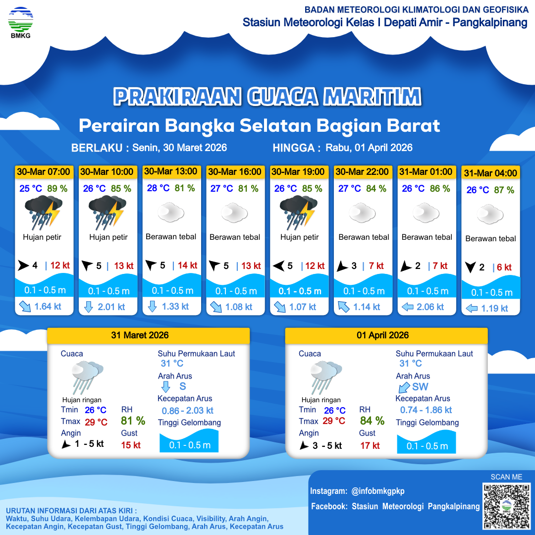 30 Mar 26, 08.00 10 jam kedepan | Tenggara 5 kt Gust Peningkatan kecepatan angin yang singkat dan tiba-tiba : 14 kt | 0.2 m Tenang | Tenggara 0.9 Knots | 27 °C | 80 % | |