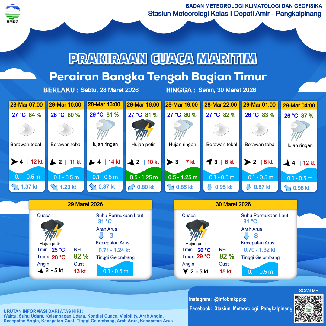 28 Mar 26, 17.00 9 jam kedepan | Barat 2 kt Gust Peningkatan kecepatan angin yang singkat dan tiba-tiba : 7 kt | 0.4 m Tenang | Selatan 0.9 Knots | 27 °C | 83 % | |