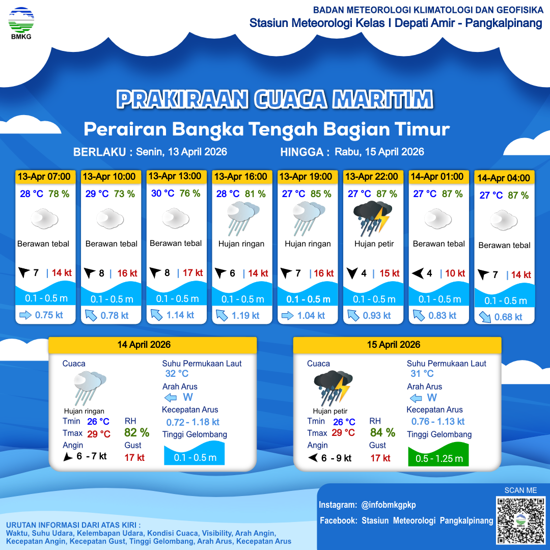 13 Apr 26, 22.00 2 jam kedepan | Berawan Tebal | Tenggara 7 kt Gust Peningkatan kecepatan angin yang singkat dan tiba-tiba : 14 kt | | | 27 °C | 86 % |