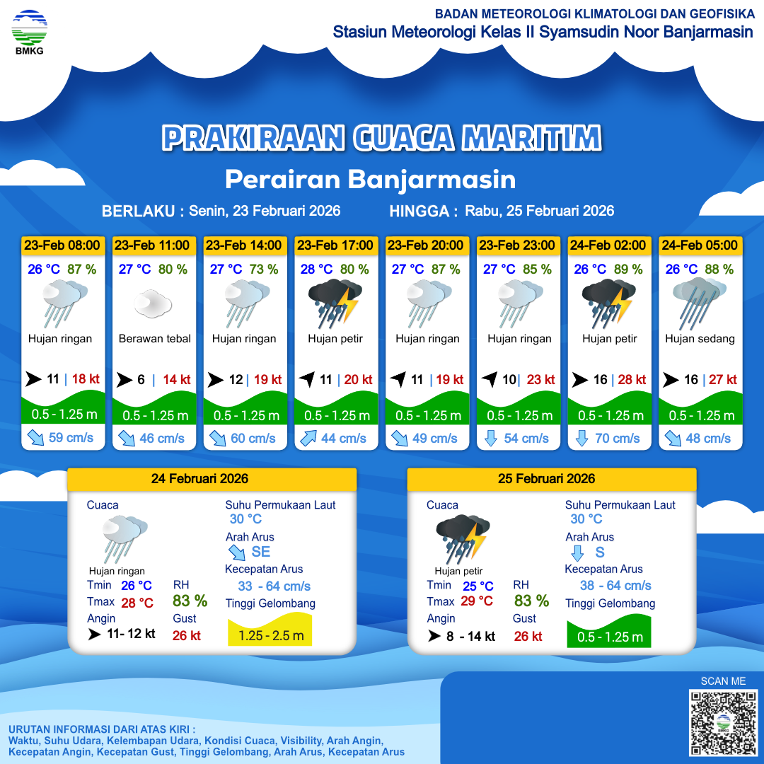 23 Feb 26, 22.00 12 jam kedepan | Barat 16 kt Gust Peningkatan kecepatan angin yang singkat dan tiba-tiba : 27 kt | 1.5 m Sedang | Timur 57.0 cm/s | 26 °C | 86 % | |