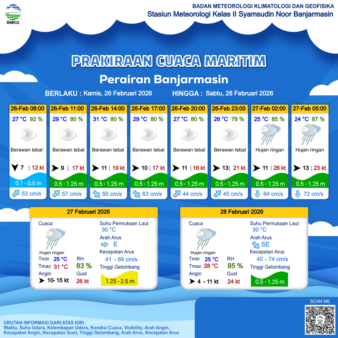 26 Feb 26, 12.00 2 jam kedepan | Barat 11 kt Gust Peningkatan kecepatan angin yang singkat dan tiba-tiba : 16 kt | 0.9 m Rendah | Timur 44.0 cm/s | 27 °C | 80 % | |