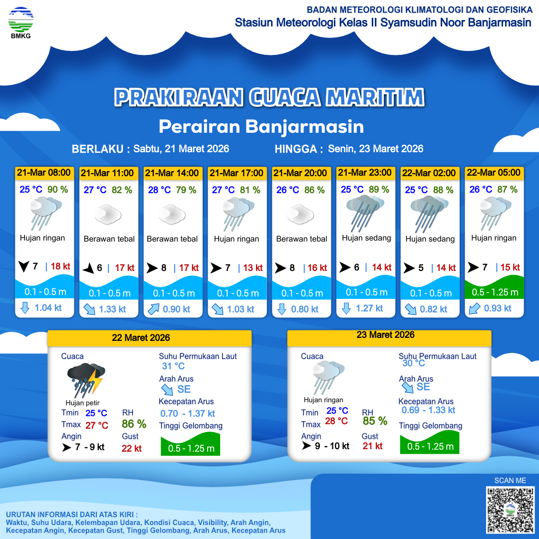 21 Mar 26, 14.00 5 jam kedepan | Barat 6 kt Gust Peningkatan kecepatan angin yang singkat dan tiba-tiba : 14 kt | 0.4 m Tenang | Selatan 1.2 Knots | 25 °C | 89 % | |