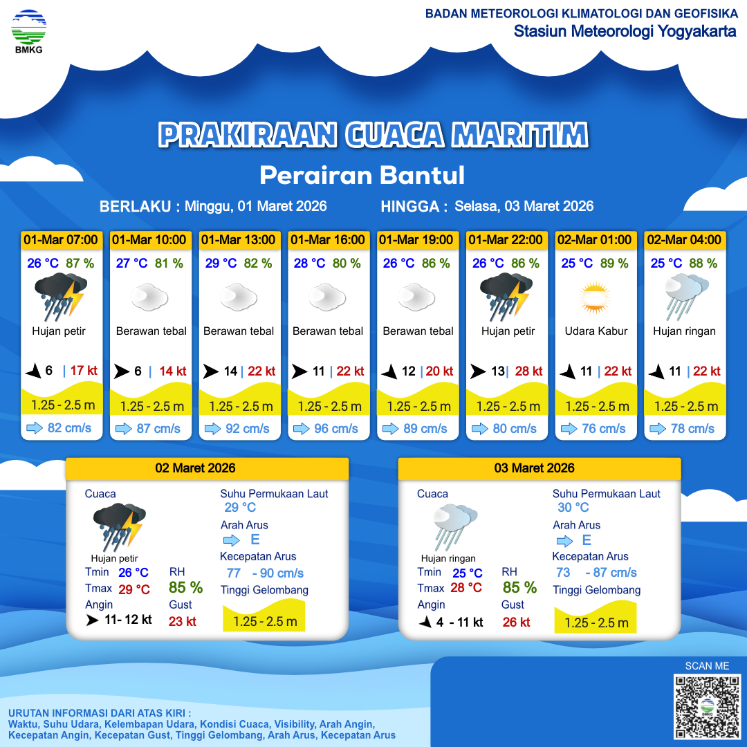 1 Mar 26, 15.00 2 jam kedepan | Barat 13 kt Gust Peningkatan kecepatan angin yang singkat dan tiba-tiba : 28 kt | 1.4 m Sedang | Timur 80.0 cm/s | 26 °C | 86 % | |