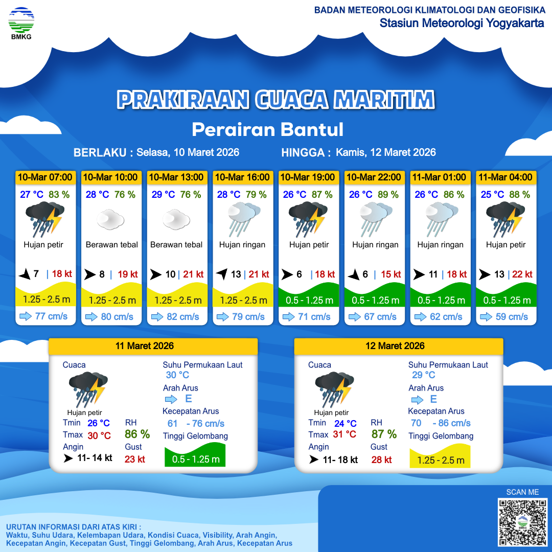 10 Mar 26, 08.00 4 jam kedepan | Barat Daya 13 kt Gust Peningkatan kecepatan angin yang singkat dan tiba-tiba : 22 kt | 1.3 m Sedang | Timur 81.0 cm/s | 28 °C | 77 % | |