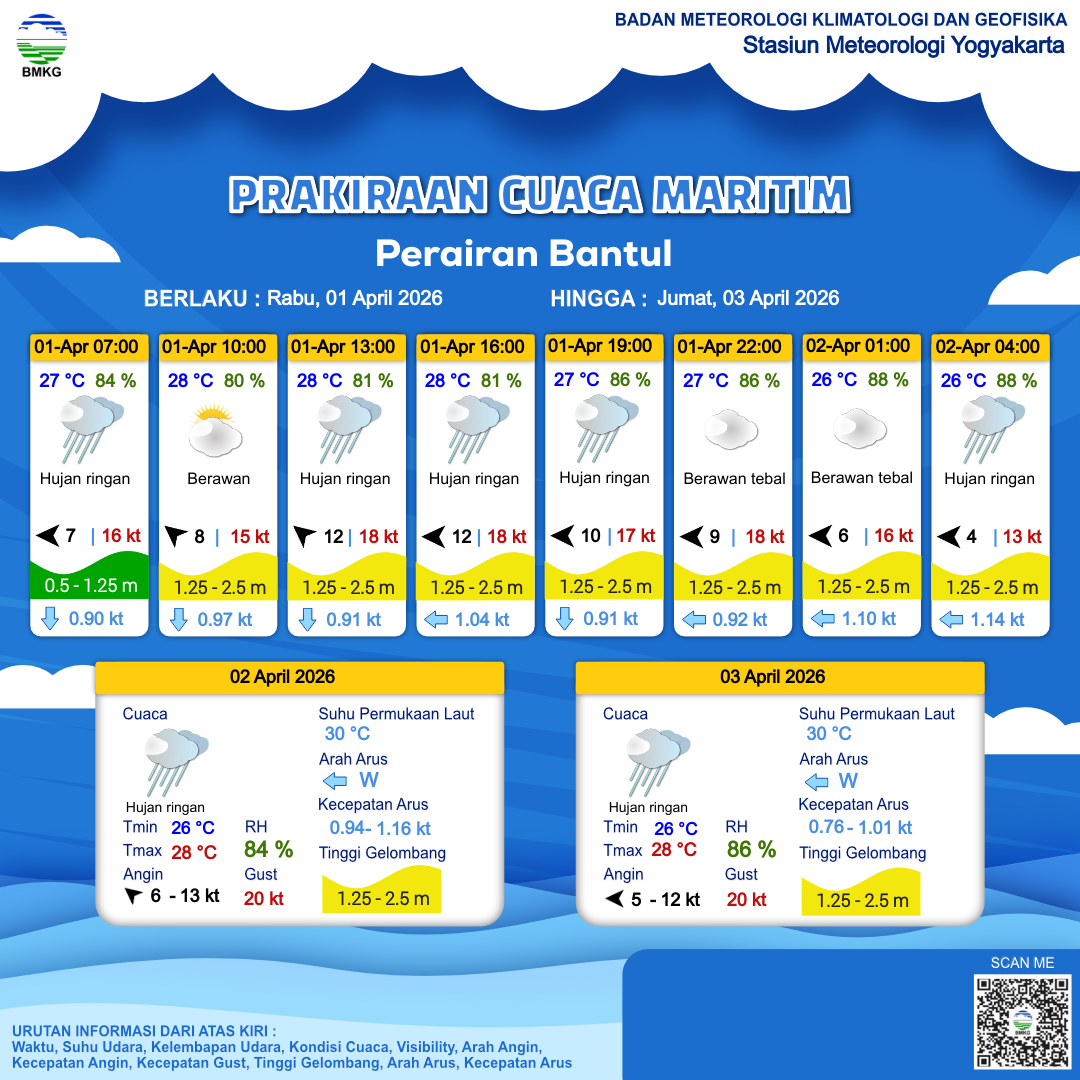 1 Apr 26, 09.00 3 jam kedepan | Timur 12 kt Gust Peningkatan kecepatan angin yang singkat dan tiba-tiba : 18 kt | 1.5 m Sedang | Barat 1.0 Knots | 28 °C | 81 % | |