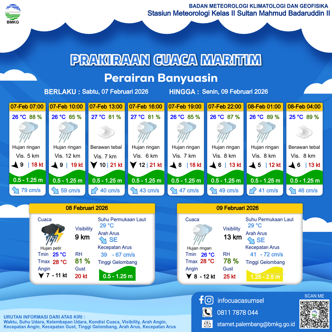 6 Feb 26, 21.00 3 jam kedepan | Hujan Ringan | Barat 8 kt Gust Peningkatan kecepatan angin yang singkat dan tiba-tiba : 19 kt | | | 25 °C | 90 % |