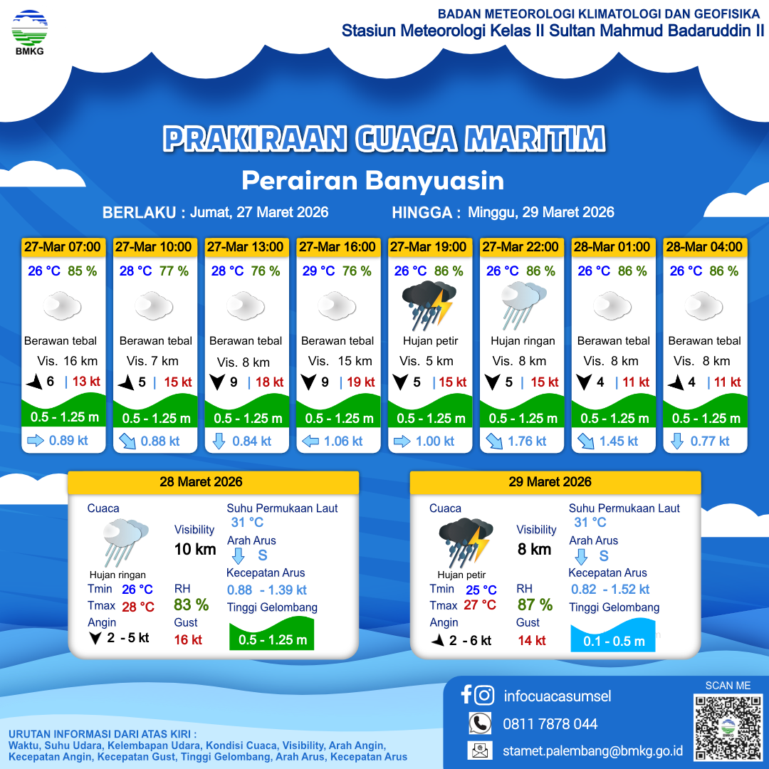 27 Mar 26, 10.00 2 jam kedepan | Utara 9 kt Gust Peningkatan kecepatan angin yang singkat dan tiba-tiba : 17 kt | 0.8 m Rendah | Barat 1.1 Knots | 29 °C | 76 % | |