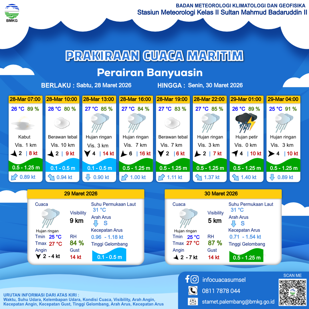 28 Mar 26, 06.00 7 jam kedepan | Utara 4 kt Gust Peningkatan kecepatan angin yang singkat dan tiba-tiba : 14 kt | 0.5 m Rendah | Selatan 0.9 Knots | 27 °C | 85 % | |