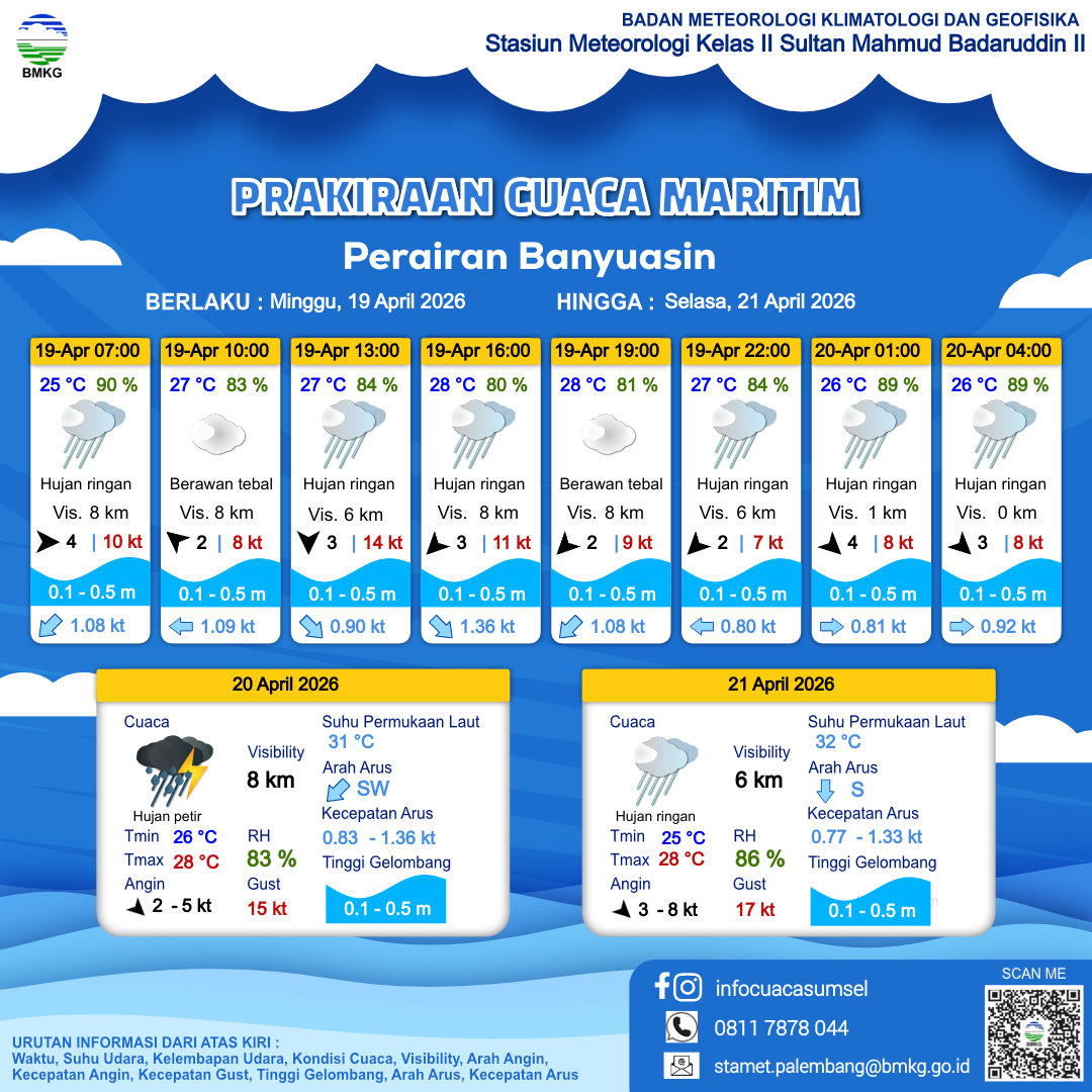 21 Apr 26, 00.00 20 jam kedepan | Barat Daya 8 kt Gust Peningkatan kecepatan angin yang singkat dan tiba-tiba : 14 kt | 0.5 m Rendah | Barat Daya 1.0 Knots | 25 °C | 93 % | |