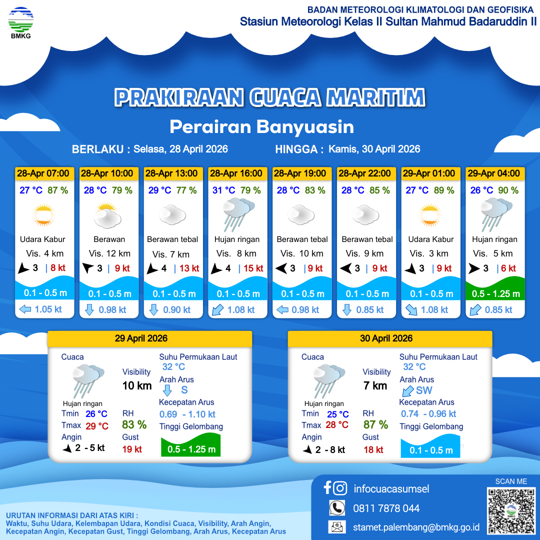27 Apr 26, 14.00 12 jam kedepan | Timur 6 kt Gust Peningkatan kecepatan angin yang singkat dan tiba-tiba : 11 kt | 0.3 m Tenang | Selatan 0.9 Knots | 28 °C | 83 % | |