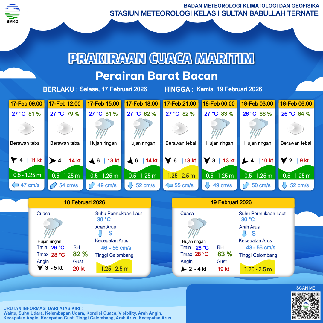 17 Feb 26, 23.00 4 jam kedepan | Berawan Tebal | Timur 4 kt Gust Peningkatan kecepatan angin yang singkat dan tiba-tiba : 9 kt | | | 27 °C | 83 % |