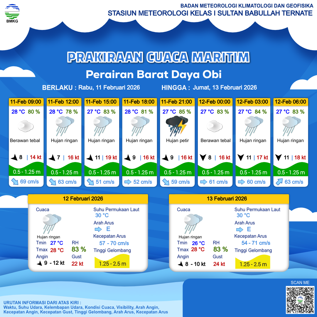 11 Feb 26, 10.00 11 jam kedepan | Barat Laut 9 kt Gust Peningkatan kecepatan angin yang singkat dan tiba-tiba : 17 kt | 0.9 m Rendah | Timur 54.0 cm/s | 27 °C | 81 % | |