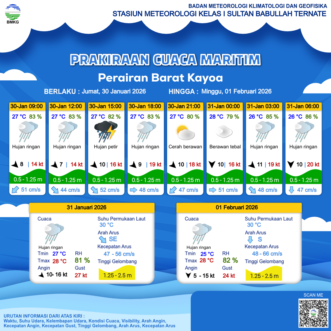 30 Jan 26, 16.00 12 jam kedepan | Utara 10 kt Gust Peningkatan kecepatan angin yang singkat dan tiba-tiba : 17 kt | 1.1 m Rendah | Timur 50.0 cm/s | 28 °C | 80 % | |