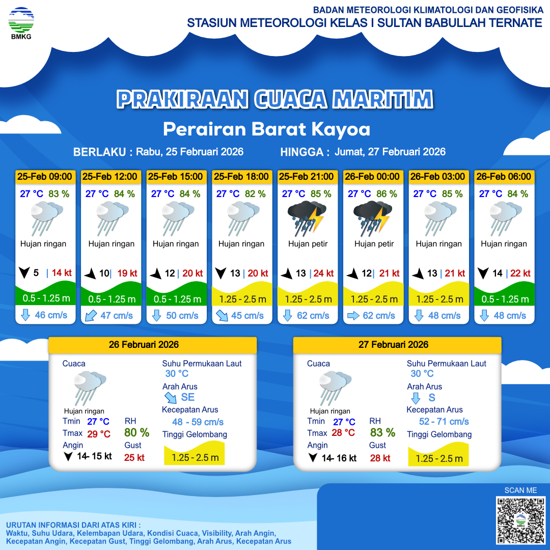 24 Feb 26, 22.00 3 jam kedepan | Hujan Ringan | Utara 10 kt Gust Peningkatan kecepatan angin yang singkat dan tiba-tiba : 20 kt | | | 27 °C | 84 % |