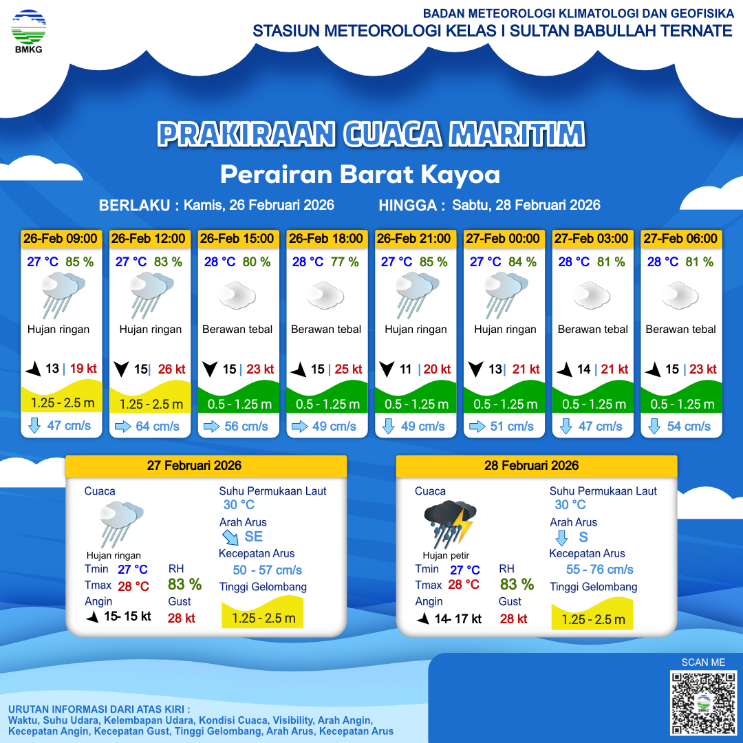 26 Feb 26, 06.00 2 jam kedepan | Utara 15 kt Gust Peningkatan kecepatan angin yang singkat dan tiba-tiba : 23 kt | 1.2 m Rendah | Timur 56.0 cm/s | 28 °C | 80 % | |