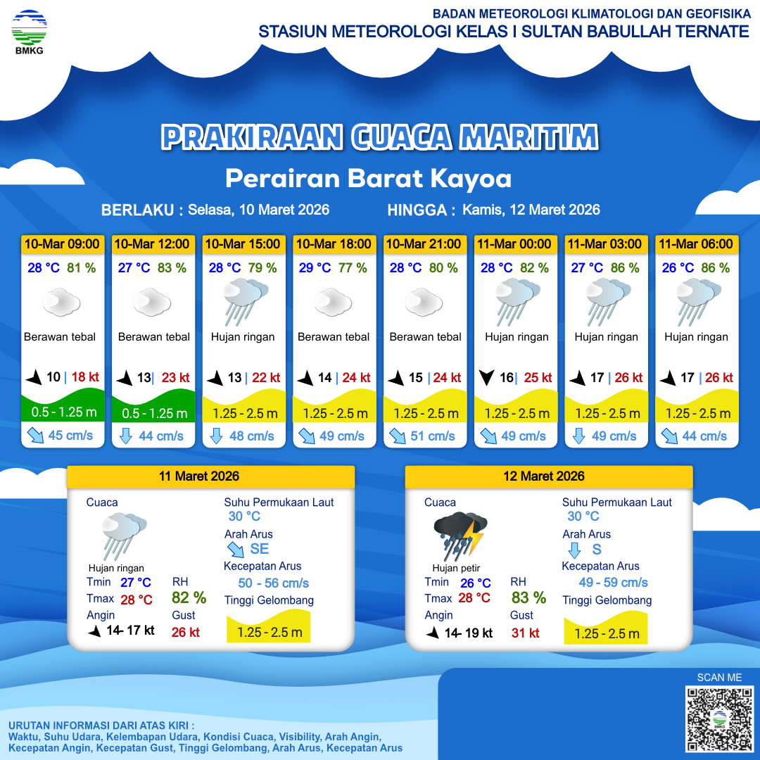 9 Mar 26, 23.00 2 jam kedepan | Berawan Tebal | Barat Laut 9 kt Gust Peningkatan kecepatan angin yang singkat dan tiba-tiba : 18 kt | | | 27 °C | 82 % |