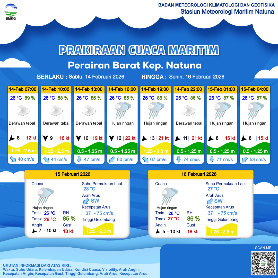 14 Feb 26, 11.00 12 jam kedepan | Timur Laut 13 kt Gust Peningkatan kecepatan angin yang singkat dan tiba-tiba : 22 kt | 1.3 m Sedang | Barat Daya 65.0 cm/s | 26 °C | 85 % | |