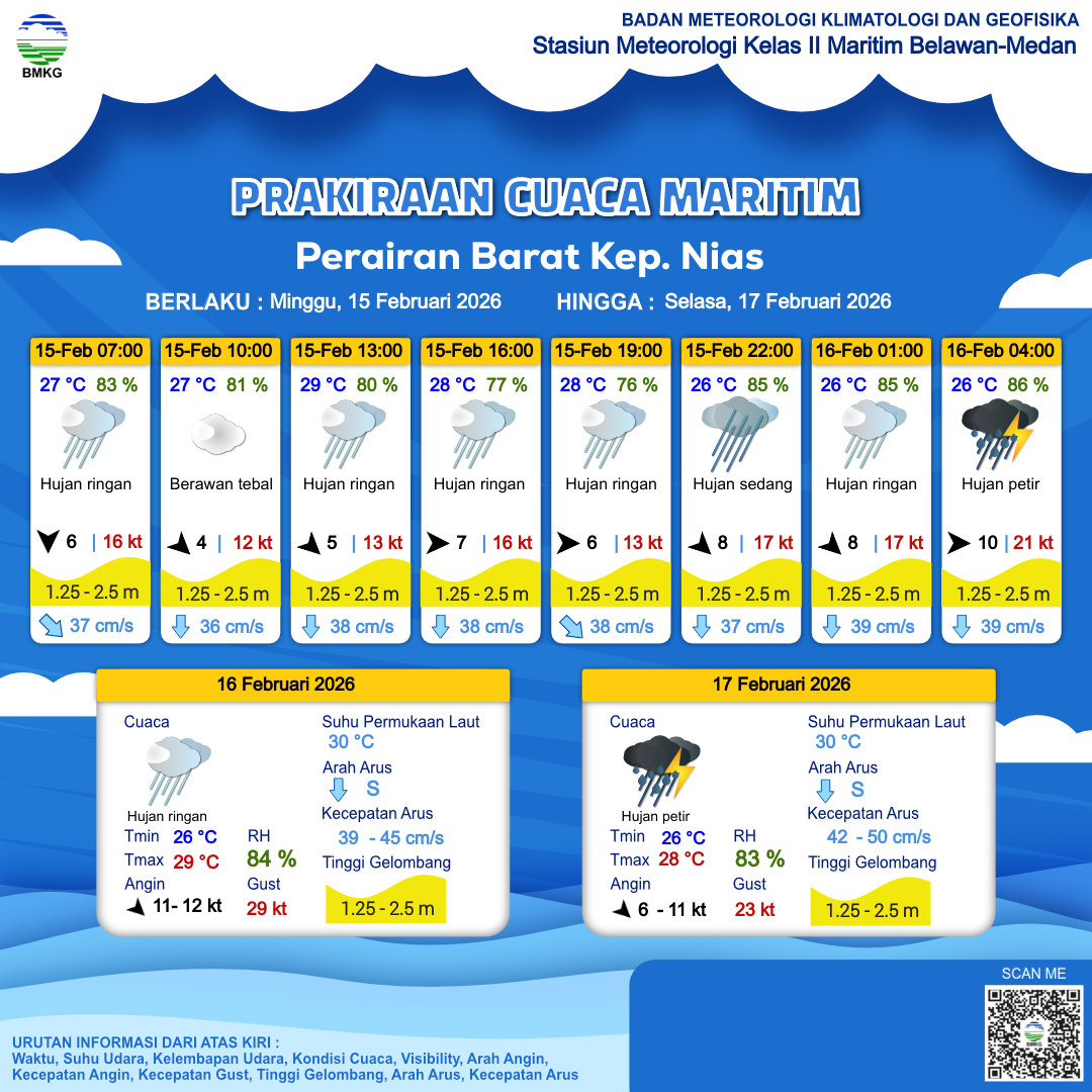 15 Feb 26, 08.00 6 jam kedepan | Barat 7 kt Gust Peningkatan kecepatan angin yang singkat dan tiba-tiba : 15 kt | 1.3 m Sedang | Selatan 38.0 cm/s | 28 °C | 79 % | |